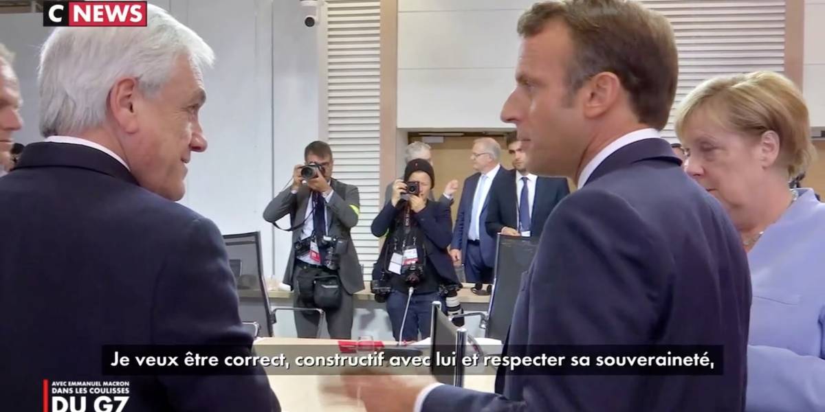 Nas imagens, divulgadas no fim de semana pela rede francesa CNews, Macron aparece ao lado da chanceler alemã, Angela Merkel, e do chileno Sebastián Piñera, que demonstram concordar com as falas do francês. "Eu queria ser pacífico. Queria ser correto, construtivo com ele (Bolsonaro) e respeitar sua soberania. Mas eu não poderia aceitar isso", disse Macron a Piñera. Merkel, que ouvia a conversa dos dois líderes, disse "não", aprovando o gesto de Macron.