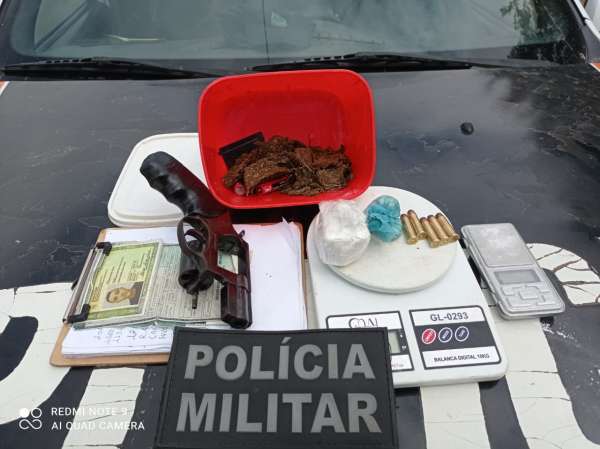 Por volta das 17h:30min de ontem, 20, policiais militares do 2° Batalhão da Polícia Militar do Ceará (PMCE), prenderam Álison Alves Silva (18) por porte ilegal de arma de fogo e tráfico de drogas. A abordagem aconteceu na Rua Ministro Colombo de Sousa, nas proximidades do Aeroporto, em Juazeiro do Norte-CE. A equipe estava fazendo patrulhamento pelo bairro Aeroporto quando se deparou com um indivíduo em atitude suspeita, pilotando uma moto. Por conta disso, a composição resolveu abordá-lo e quando o fez, encontrou com o mesmo um revólver calibre 38, Num. AA 460709, com cinco munições intactas do mesmo calibre e uma pedra de substância análoga à cocaína equivalente a 108 gramas. Durante a abordagem, o indivíduo informou que na sua residência, localizada na cidade de Barbalha tinha mais droga guardada. A equipe então se dirigiu até o local informado, e, chegando, encontrou 78 gramas de substância análoga à maconha e duas balanças de precisão. Todo o material foi apreendido, assim como a moto modelo CG Titan, com placa HVO 4961, de cor vermelha, que ele estava pilotando. De posse de todos esses fatos, o indivíduo foi preso e enquadrado no artigo 12 do Estatuto do desarmamento e artigos 33 e 35 da Lei de entorpecentes, procedimento realizado na Delegacia Regional de Juazeiro do Norte.